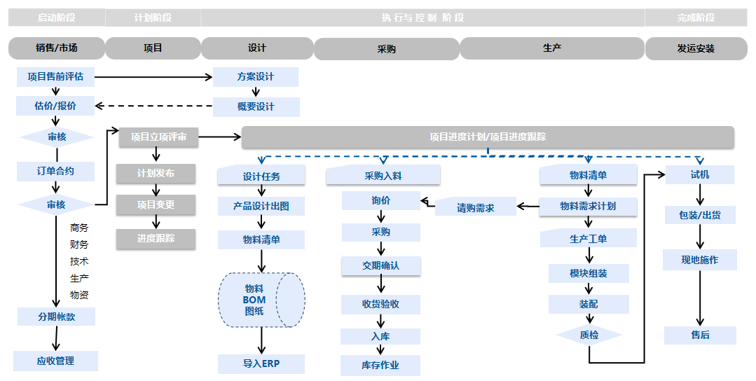系统基于项目流程的标准,项目各个节点贯穿整体项目进展,完整管控和呈现散落在不同职能部门里的任务进度信息,项目进度实时、透明。