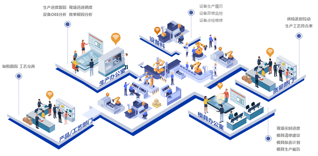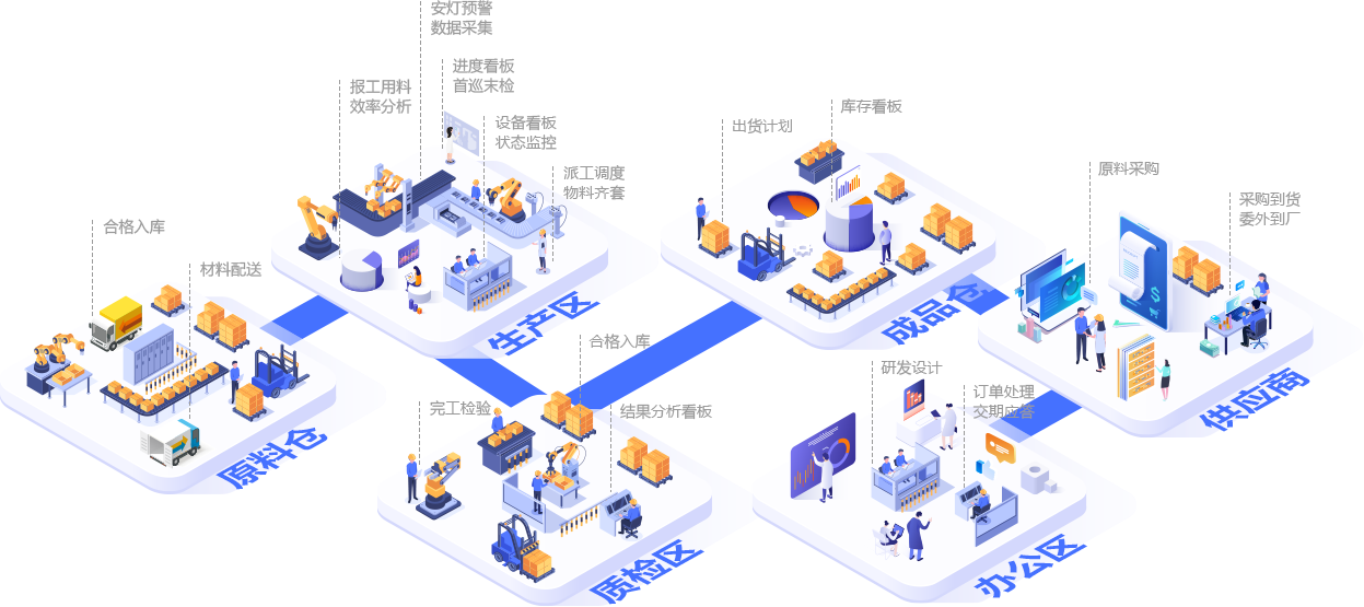 一套完整闭环式制造运营管理解决方案,通过充分打通各个阶层,集成CRM、BPM、PMS、APS、ERP、MES、WMS、BI 等建立统一管理平台,管理所有设备、人、信息、系统,低成本实现生产制造透明化、智能化。